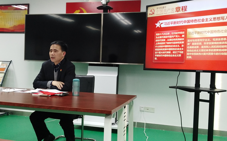 为周全深入学习宣传贯彻党的十九大精神,,,,落实省委学习宣传贯彻党的十九大精神“五个一”行动要求,,,,2017年12月8日,,,,省菠菜担保网集团党委副书记沈国强为集团本部三个党支部的党员上党课,,,,向导宽大党员配合学习党的十九大审议通过的新《党章》。。。